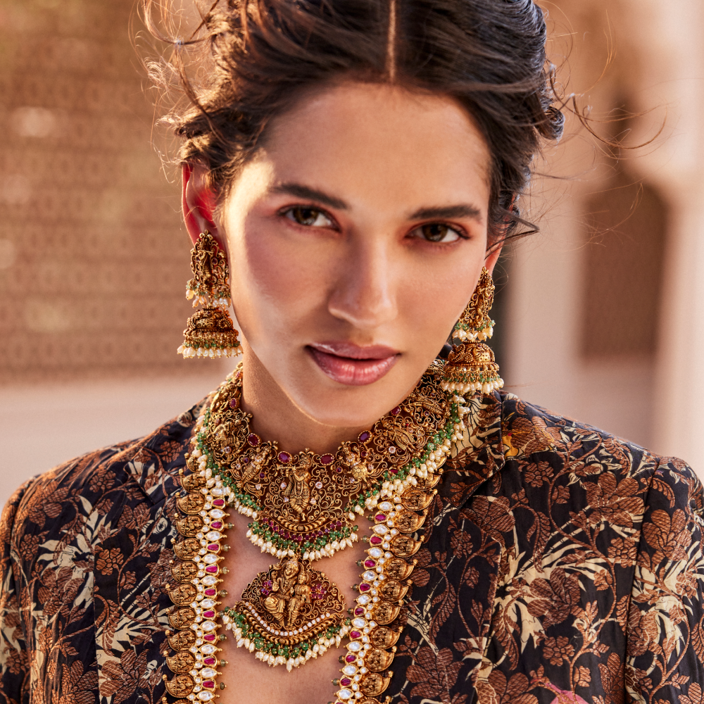 Experience the opulence of our 22K Lakshmi Nakshi Antique Temple Gold Jhumka, an exquisite example of antique craftsmanship. The divine motif of Goddess Lakshmi is depicted seated gracefully on a lotus adorned with radiant stones. The intricately designed bell features Lakshmi motifs accented by gleaming stones, with two birds perched elegantly at the top. The base is adorned with delicate gold balls, creating a timeless piece that exudes divine elegance and luxury | Best Jewellers in Mumbai